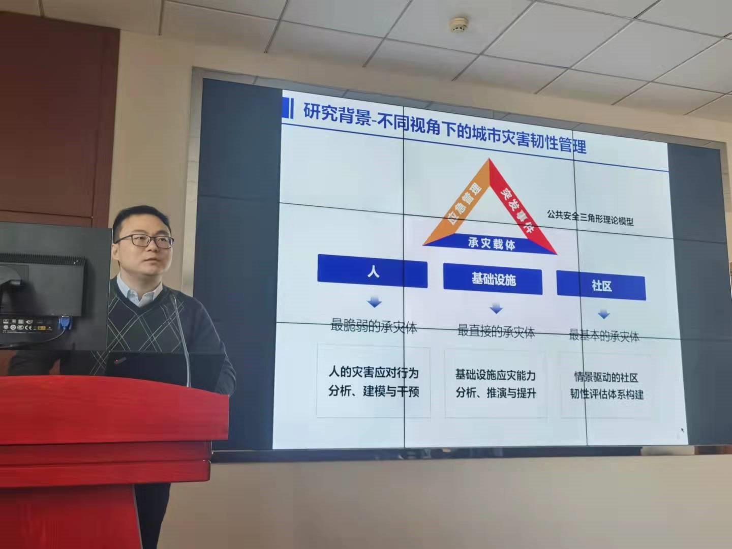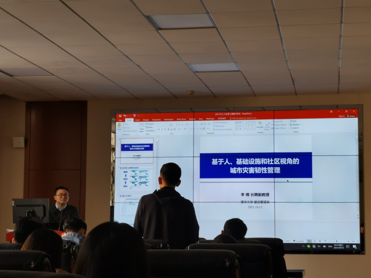 李楠老师为在座师生就基于人、基础设施和社区视角的城市灾害韧性管理相关研究工作和最新进展进行分享。报告分为三个部分,第一部分针对最脆弱的承灾体(人),介绍了人的灾害应对行为分析、建模与干预;第二版分针对最直接的承灾体(基础设施),介绍了基础设施应灾能力分析、推演与提升;第三部分针对最基本的承灾体(社区),介绍了情景驱动的社区韧性评估体系构建。报告结束后,多位参会师生就韧性管理、仿真模拟等问题积极提问,李楠老师与参会师生就相关问题进行了深入交流。