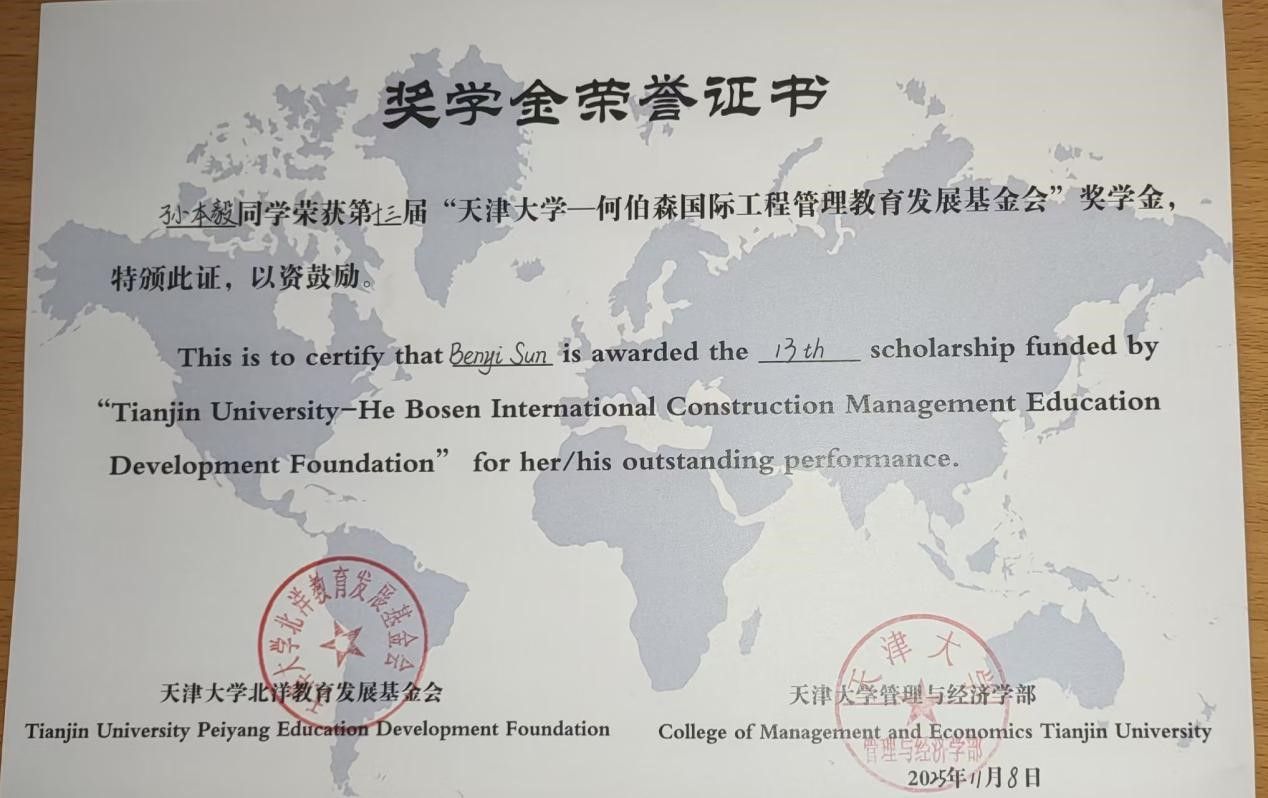 日本a片本科生孙本毅荣获第十三届“天津大学—何伯森国际工程管理教育发展基金”奖学金